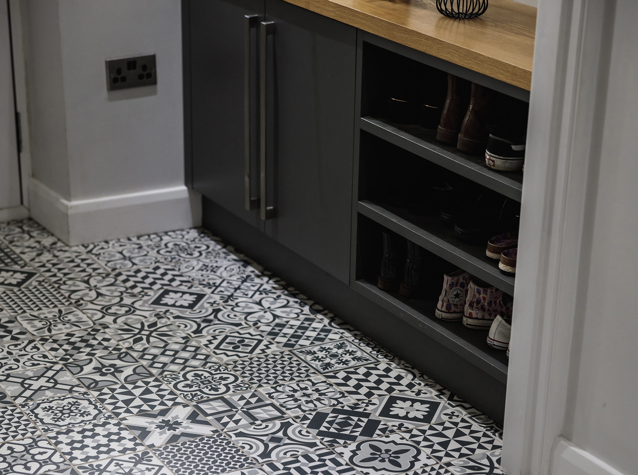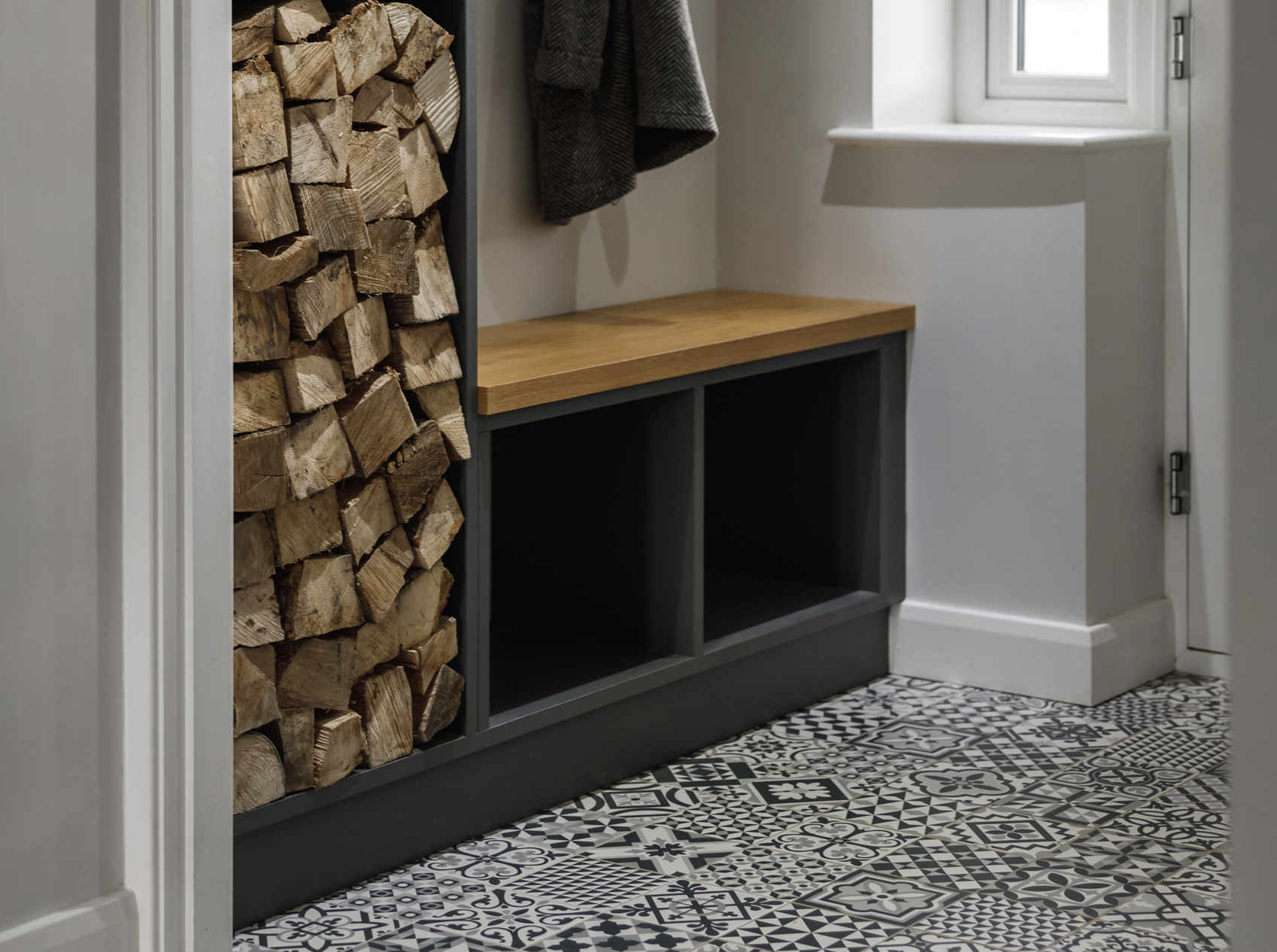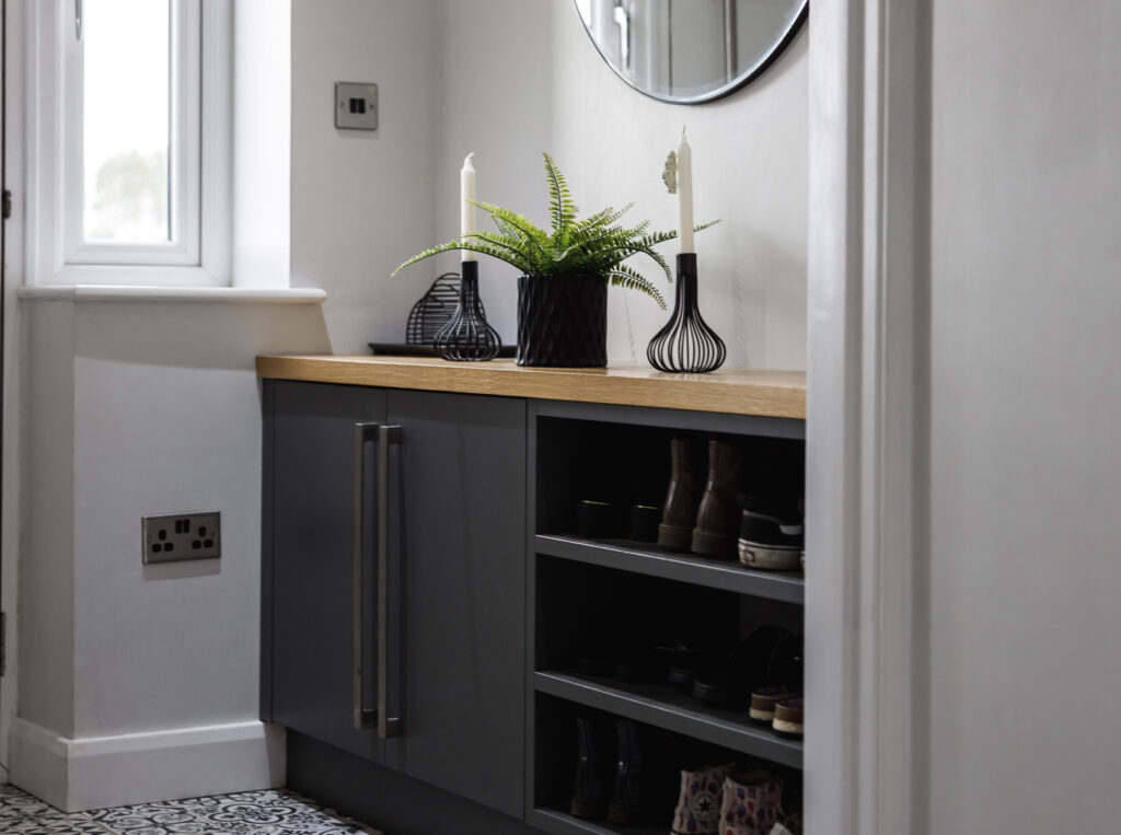 This bespoke entrance porch furniture was designed to make everyday life easier while keeping the space looking calm and considered. Built to house the electric meter neatly out of sight, the layout also provides generous storage for shoes, logs, coats, and everyday clutter. A built-in bench with hidden storage below offers a practical place to sit, making it ideal for busy mornings and family life. Painted in a client-chosen colour and finished with an oak-veneered top, the result is a purposeful, hard-working space that still looks good.