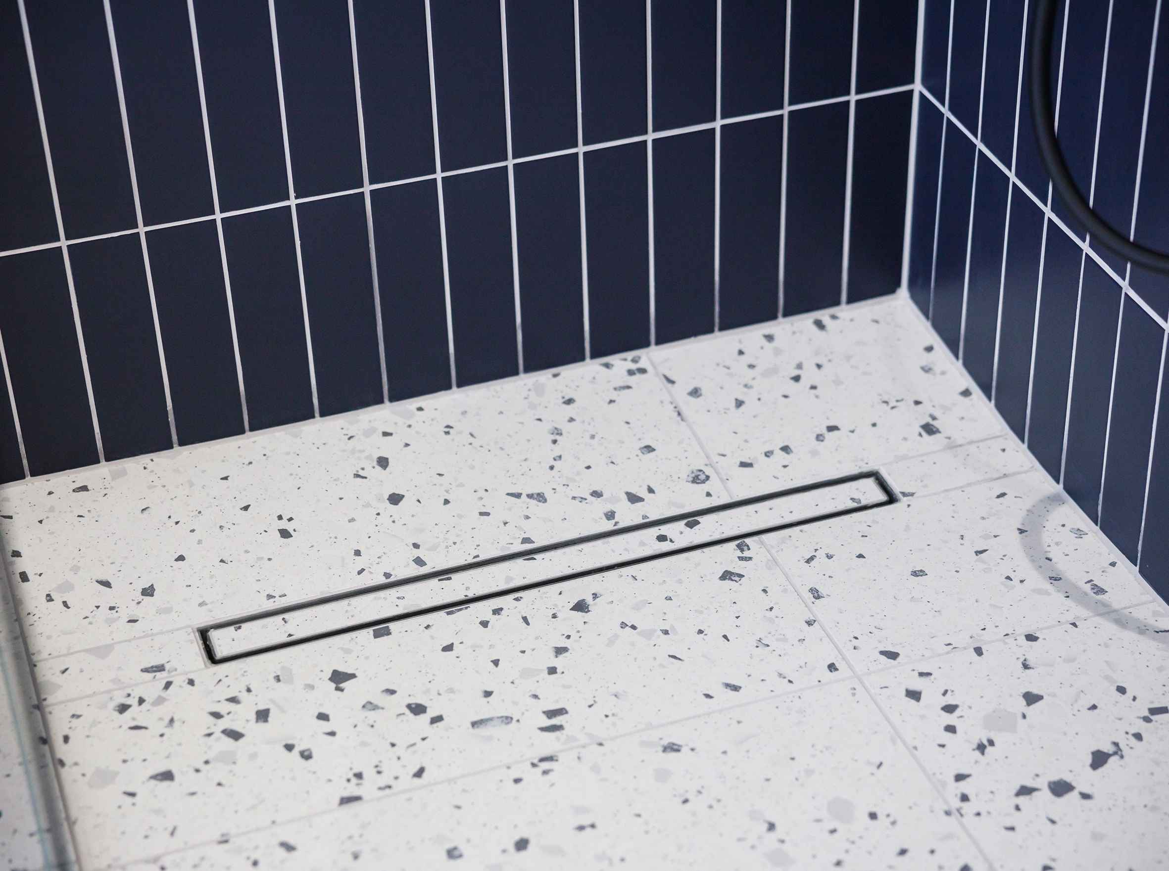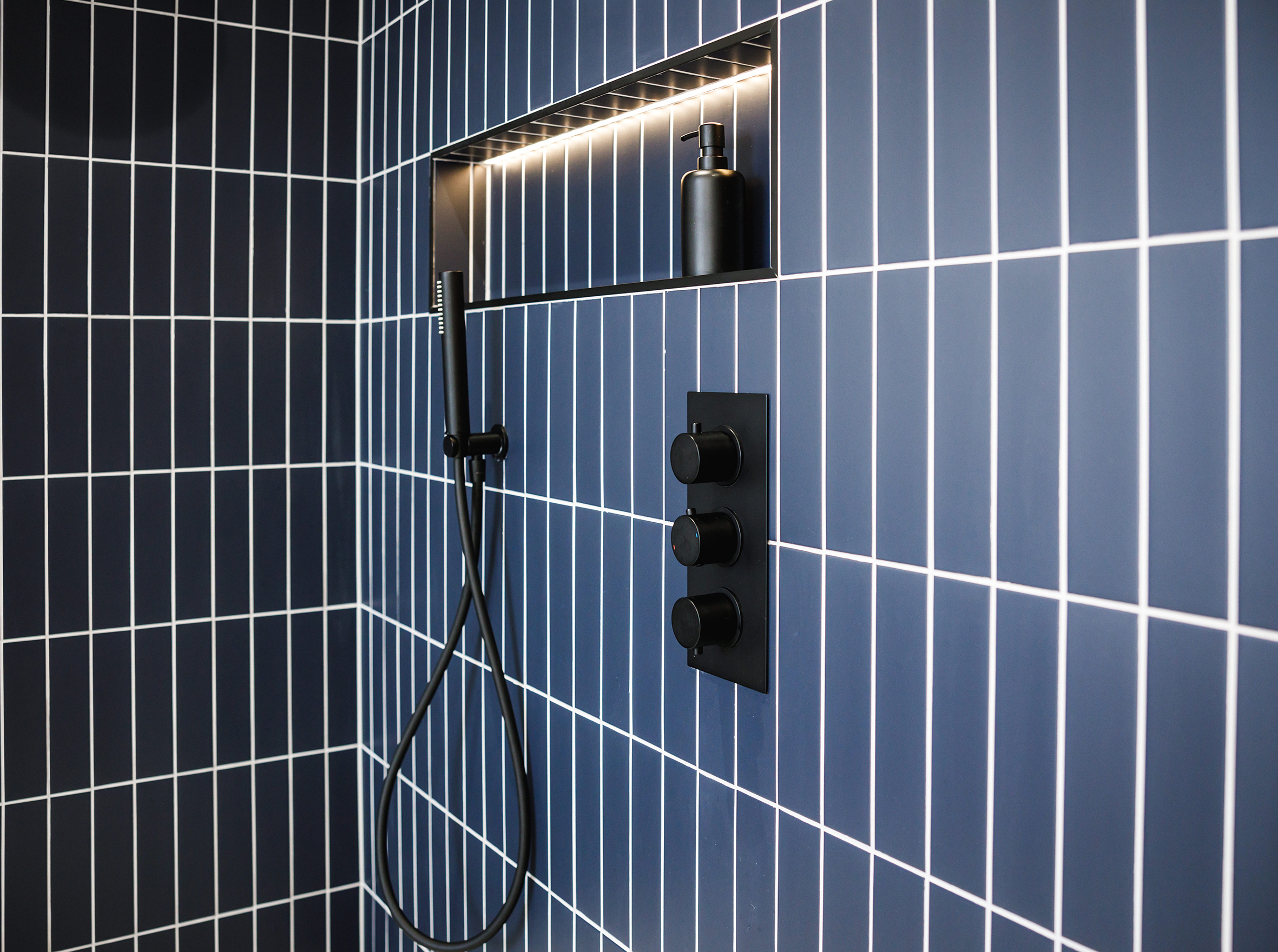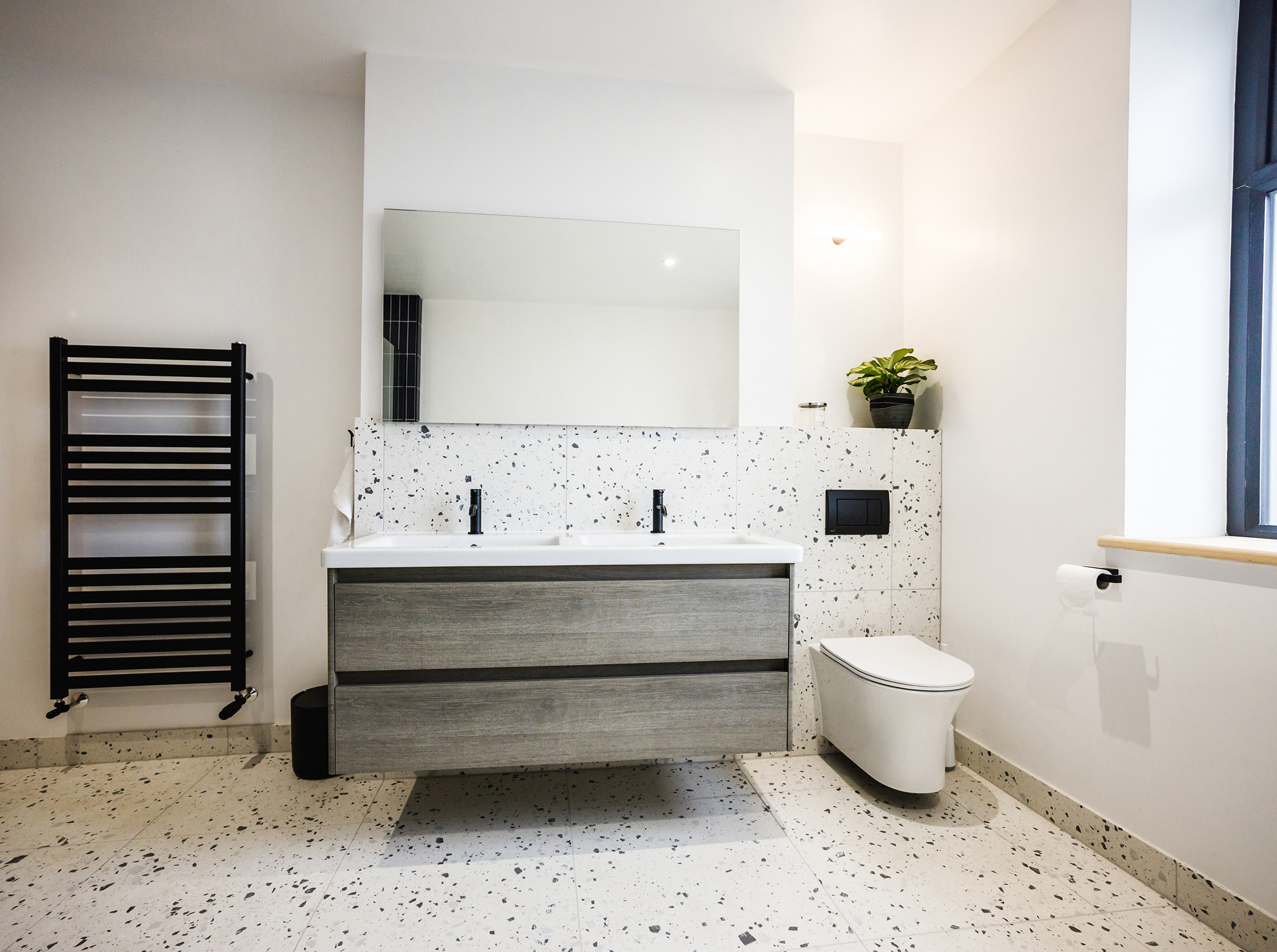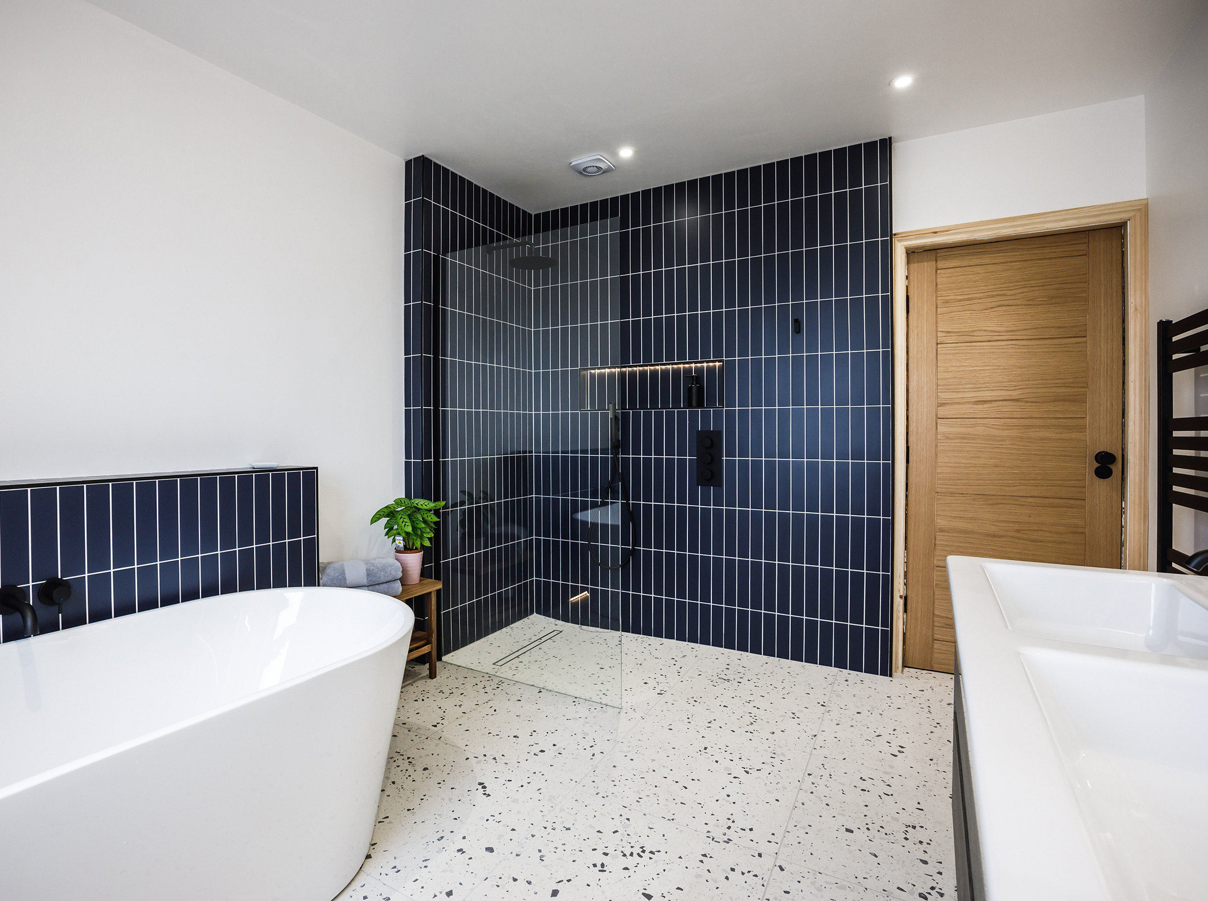 A full bathroom revamp was undertaken in this Victorian property, including the replacement of inadequate floor joists to support the weight of new floor tiles. A new framework was constructed to support a wall-hung toilet, alongside the installation of electric underfloor heating, new plastering, plumbing, and electrics. Lighting was upgraded throughout, with feature lighting integrated into wall niches. The family bathroom features a double basin, an Impey wetroom shower tray, a wall-hung toilet, and a freestanding bath, finished with floor-to-ceiling tiling that pairs terrazzo tiles with a solid-colour vertical slim brick tile.